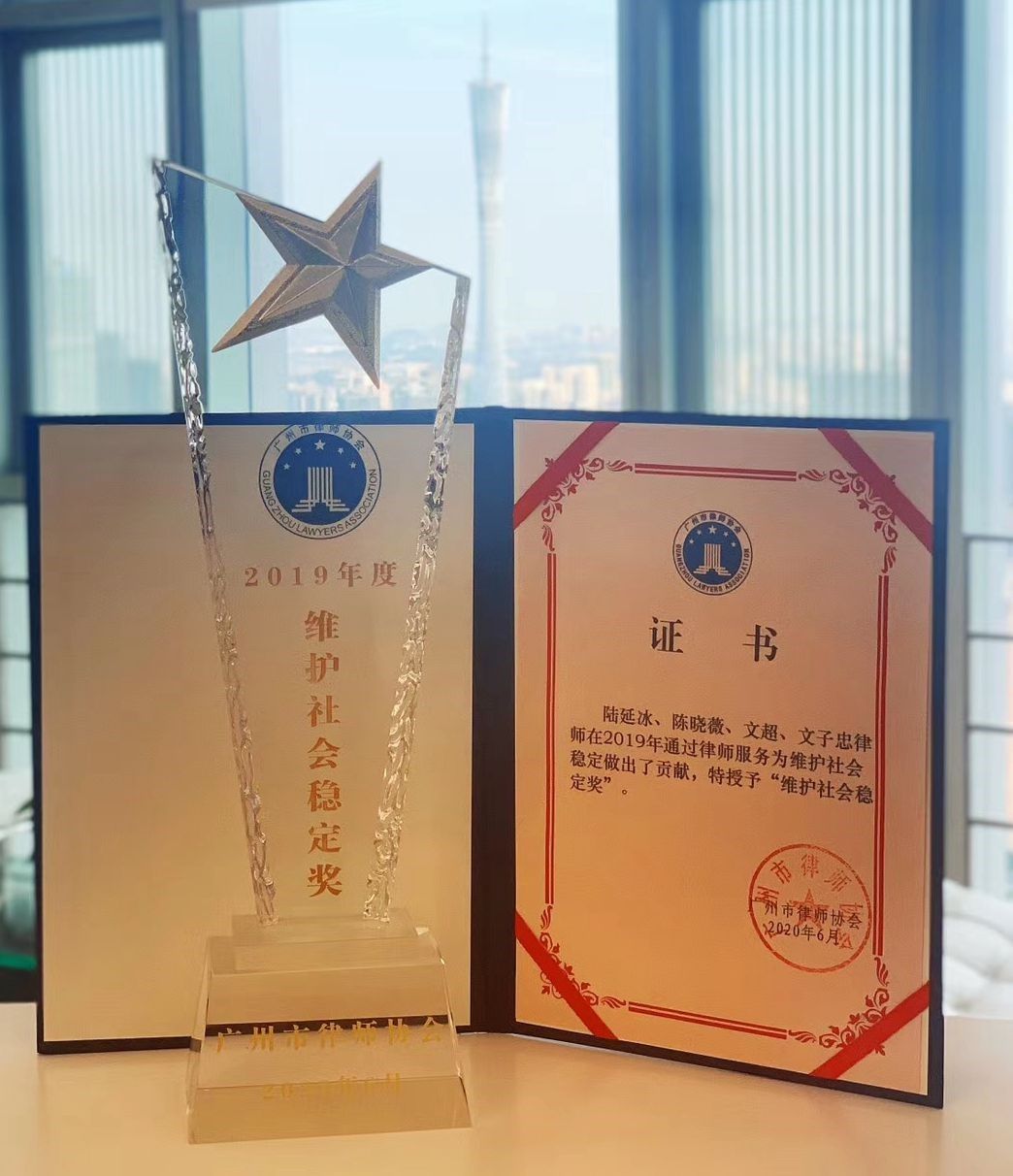 我团队陆延冰、陈晓薇、文超、文子忠律师因该案获广州市律师协会颁发“2019年度维护社会稳定奖”。