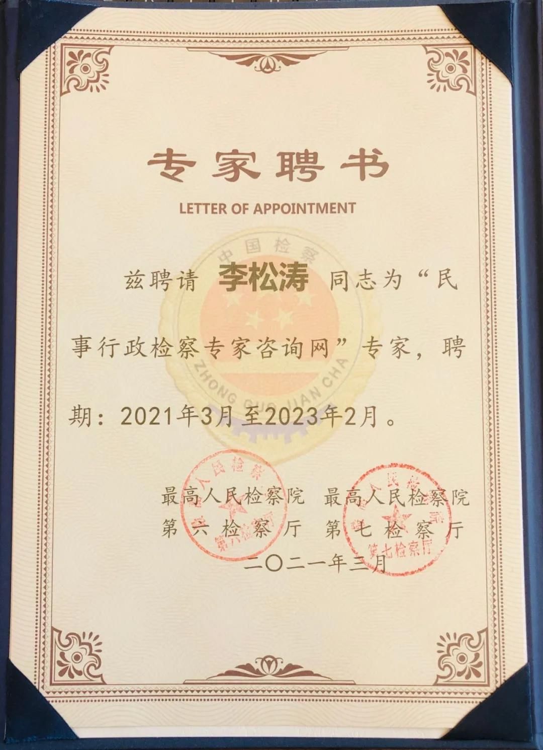 近日,广东天禄盟德律师事务所执行主任李松涛律师接受最高人民检察院第六检察厅、第七检察厅的聘请为“民事行政检察专家咨询网”专家,聘期为2021年3月至2023年2月。