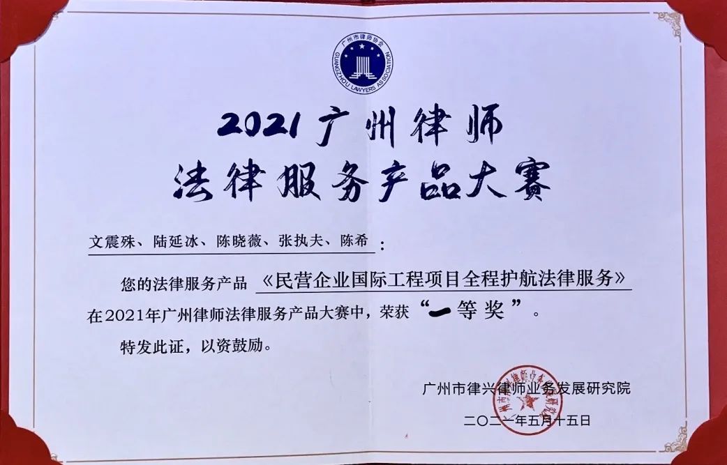 2021年5月15日,“2021广州律师法律服务产品大赛”决赛结果揭晓,本所参赛的“民营企业国际工程项目全程护航”法律服务产品从49家律所共133个参赛作品中脱颖而出,荣获大赛一等奖。