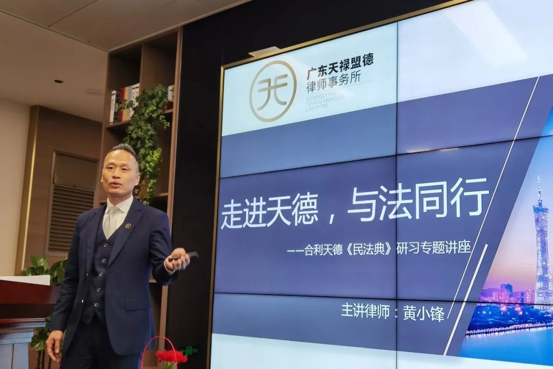 2020年12月25日,广东天禄盟德律师事务所合伙人黄小锋律师受邀在广州最美城市综合体——合利.天德广场,为其发展商广州合利创兴控股有限公司,带来《民法典》研习专题讲座。