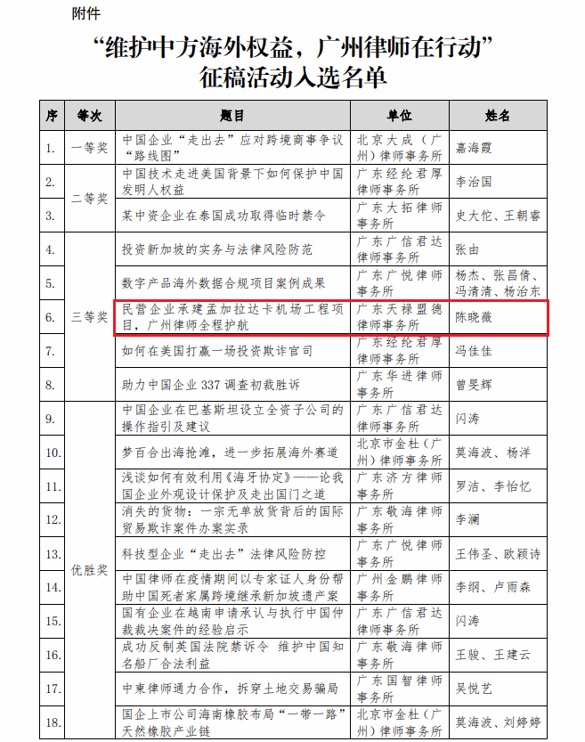 近日,广州市律师协会“维护中方海外权益,广州律师在行动”征稿活动评奖结果揭晓。其中,本所陈晓薇律师撰写的《民营企业承建孟加拉卡达机场工程项目,广州律师全程护航》一文荣获三等奖。