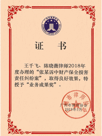 本所王千飞和陈晓薇律师善用检察机关的法律监督职能,成功破解了案中谜案,维护了委托人的合法权益,并因该案获广州市律师协会颁发“2018年度业务成果奖”。